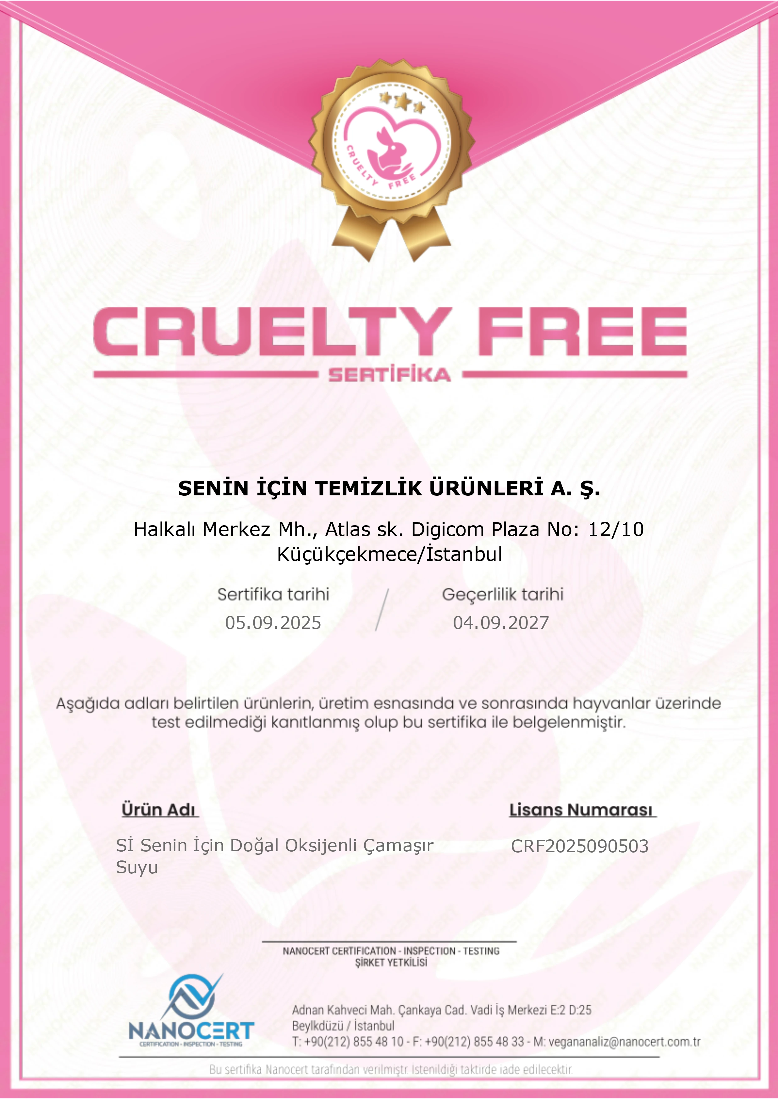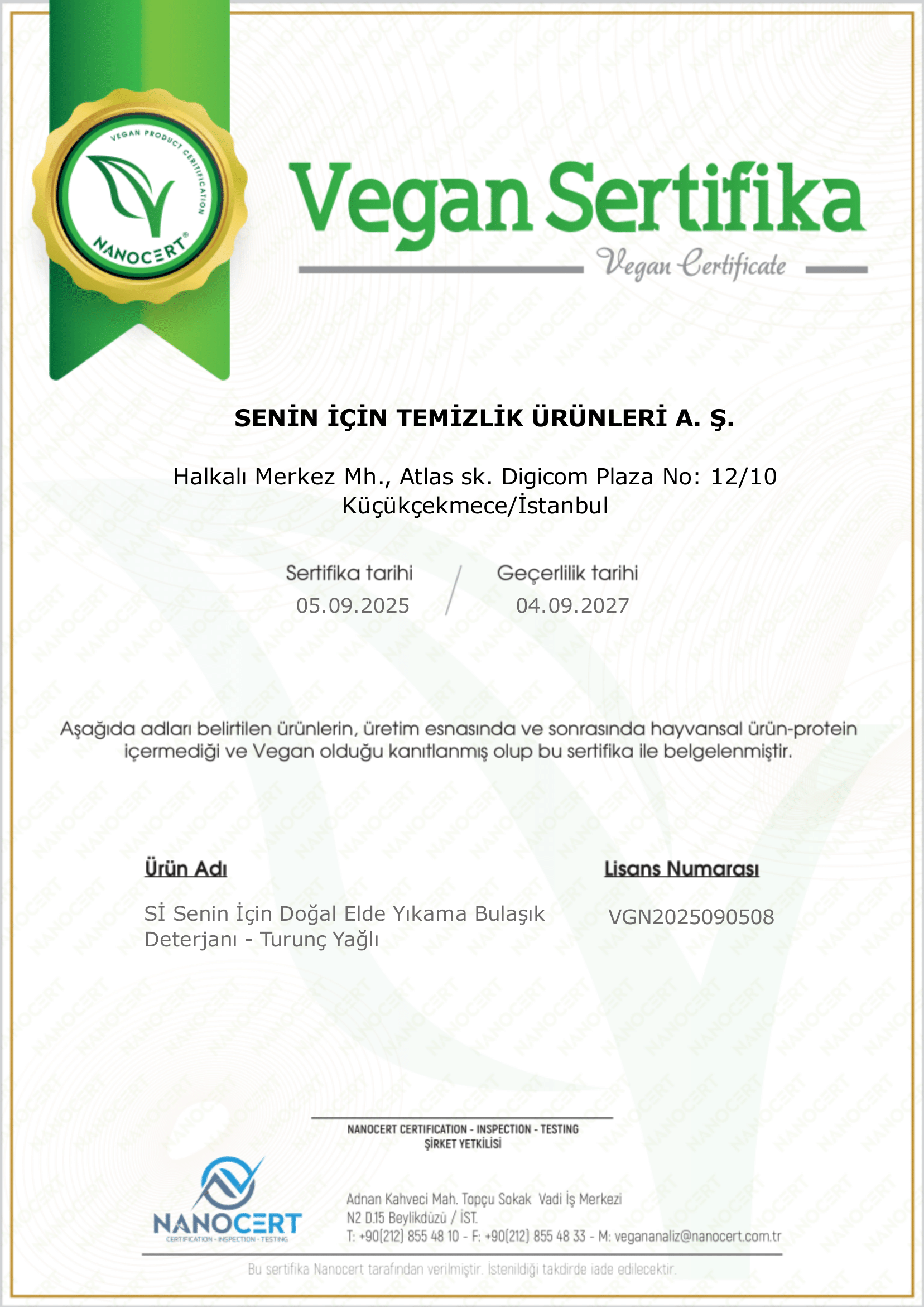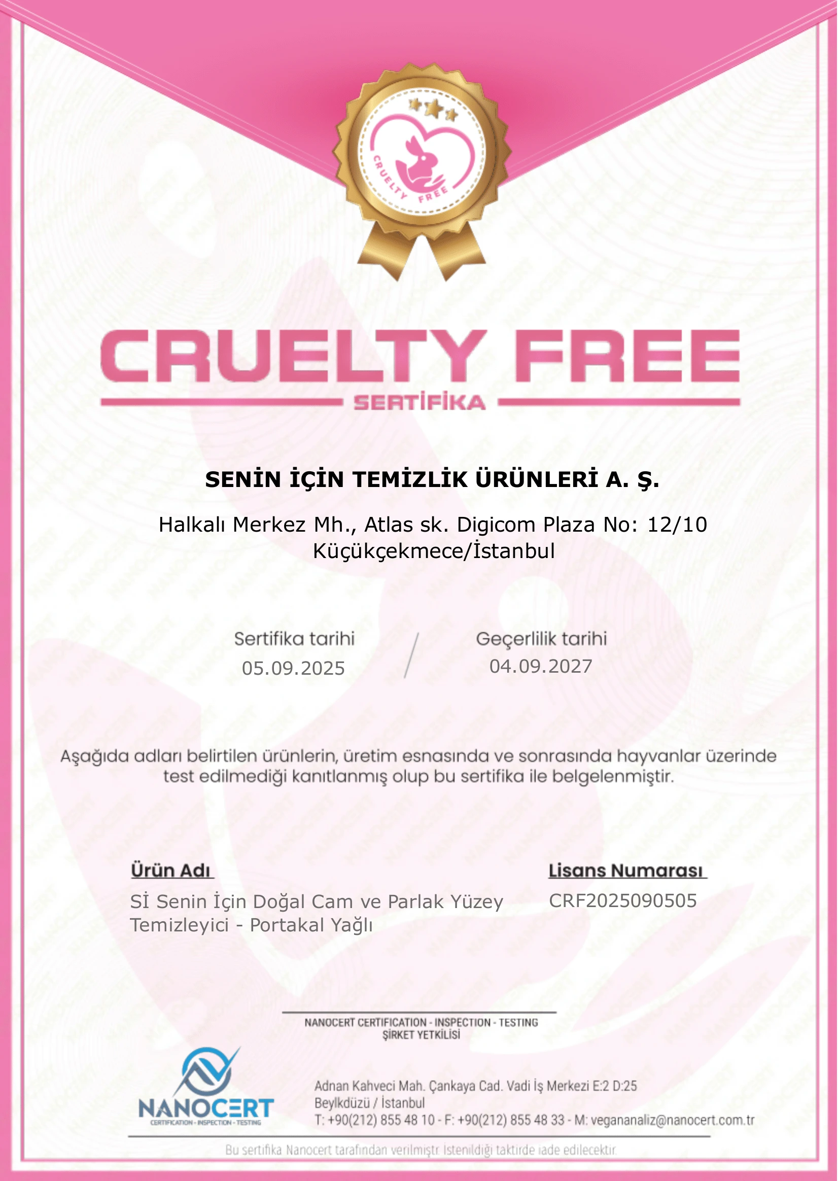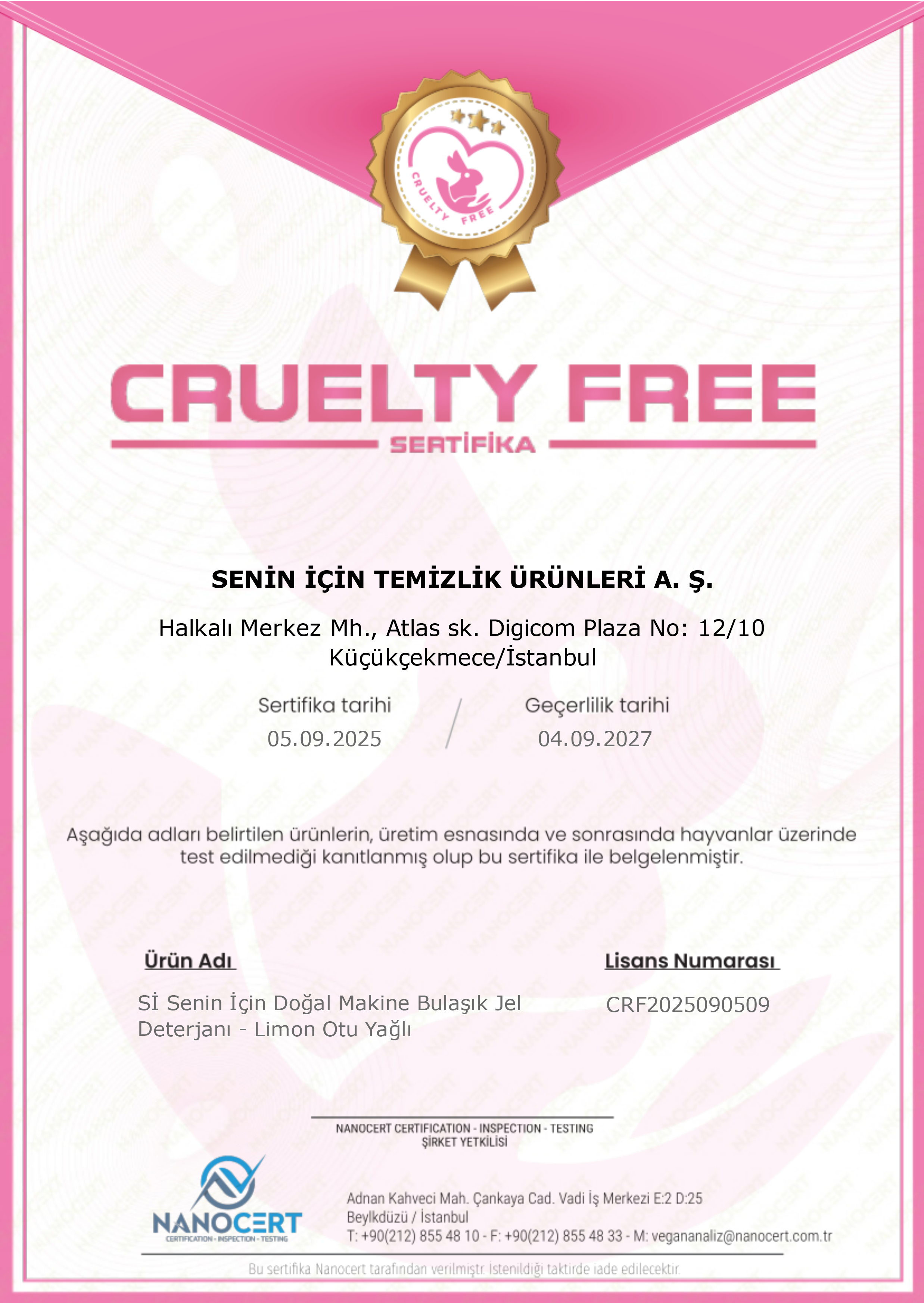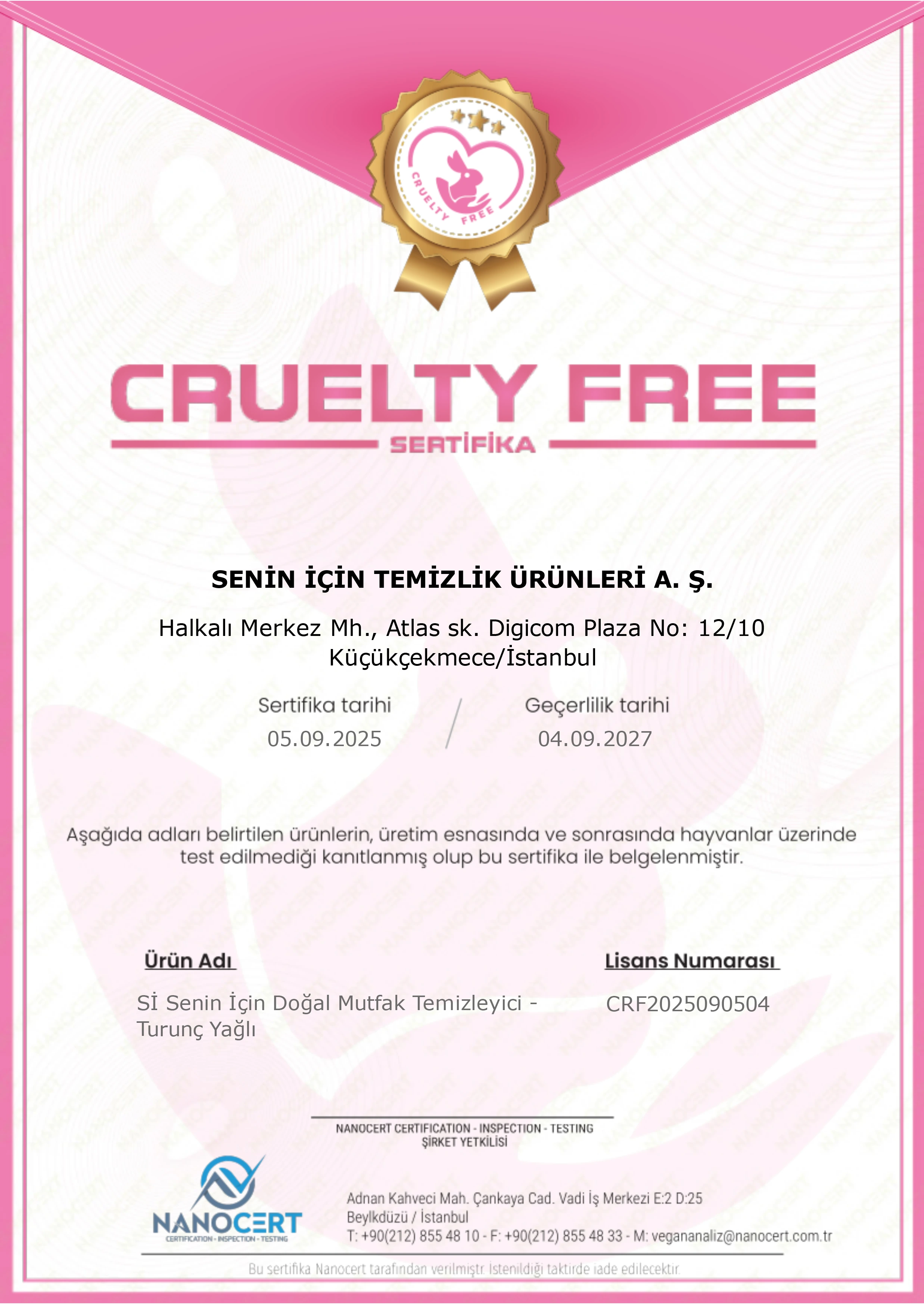 Senin İçin temizlik ürünleri vegan ve cruelty free standartlarına uygun olarak üretilir.